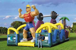 Two opponents face a run covering over 85 feet including; obstacle walls, squeeze plays, tunnel crawls, etc... Each opponent changes sides before climbing up and over the biggest obstacle of all; the giant slide down and through the legs of the IronMan. The ultimate in obstacle courses! 35'Lx25'Wx20'H/req. (4) 20amp plugs