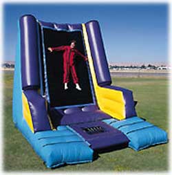 An instant classic made famous by David Letterman. Wearing a sticky jumpsuit, players run up an inflatable ramp, bounce on a small trampoline called a load cell and hurl themselves onto a super-sticky inflatable wall. Whichever way you hit, you stick – upside-down, sideways, anyway. Completely safe and totally fun. 18'Lx12'Wx14'H/req. 20amps