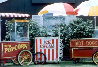 Canopied old-fashioned food carts are available to serve just about anything. Common requests include: Churros, popcorn, cotton candy, snow cone, soft and gourmet pretzels, peanuts, hot dogs, nachos, lemonade, soft drinks, candy apples, ice cream, pizza, fresh baked cookies, Hawaiian shaved ice, etc.
